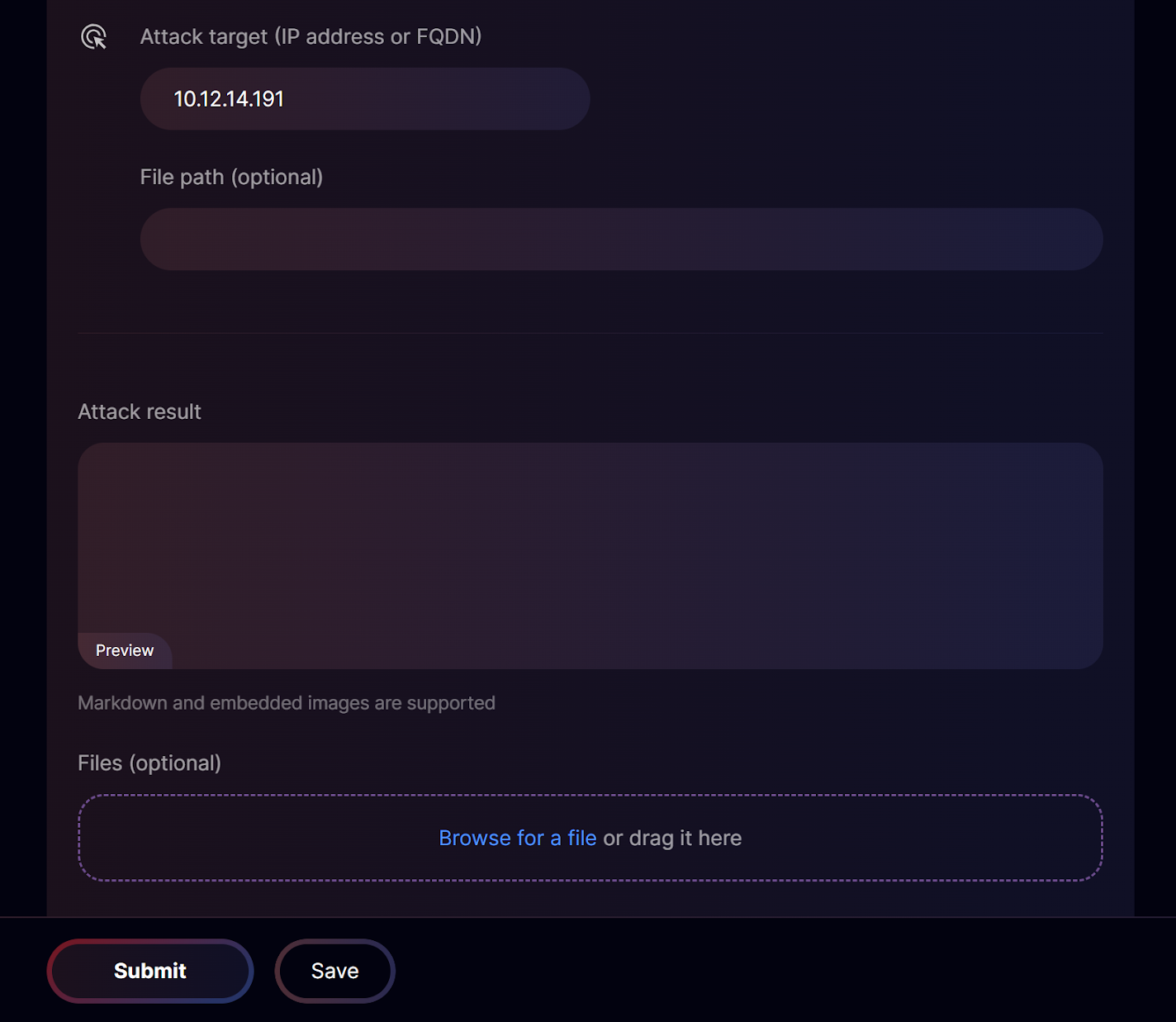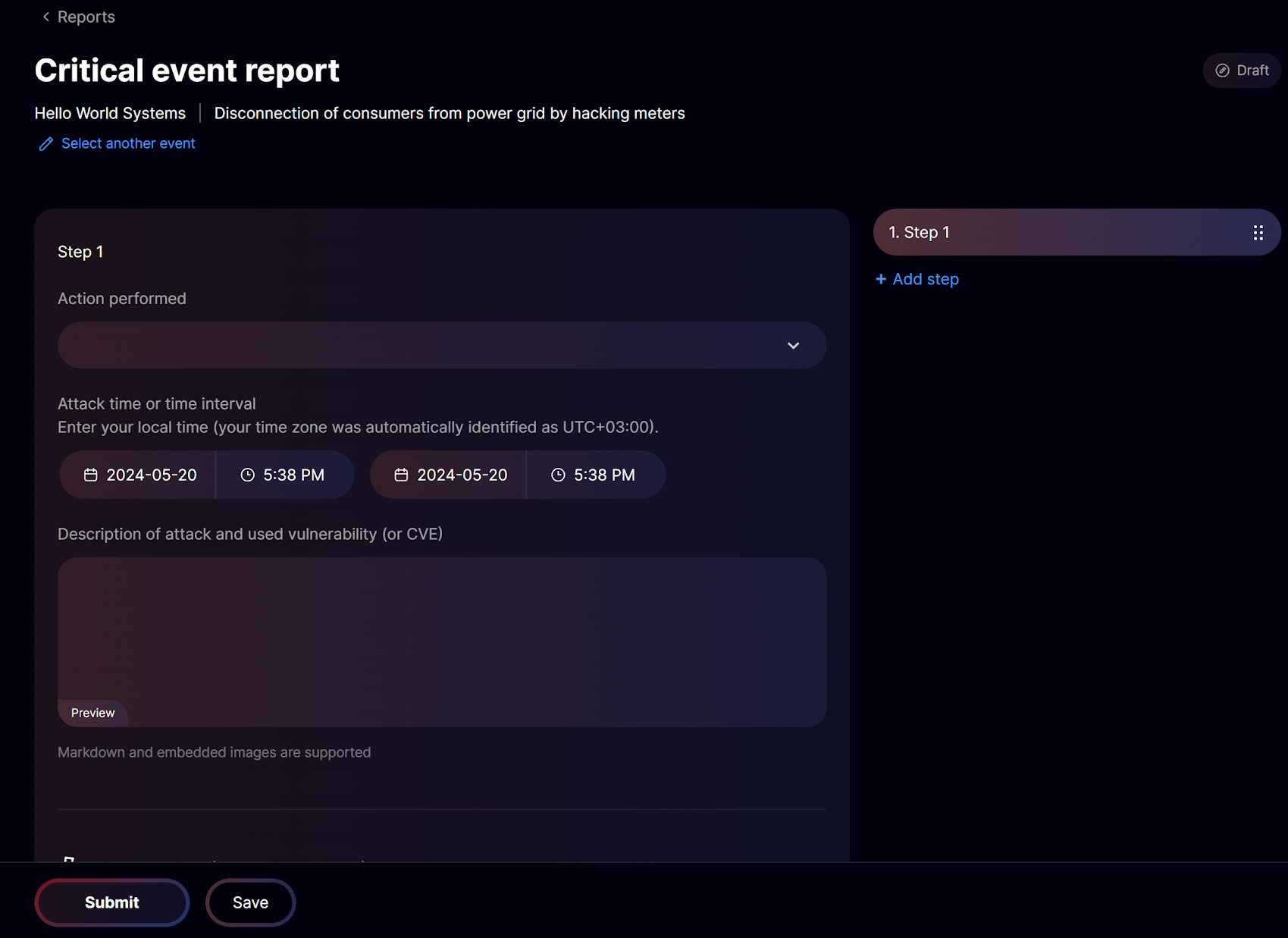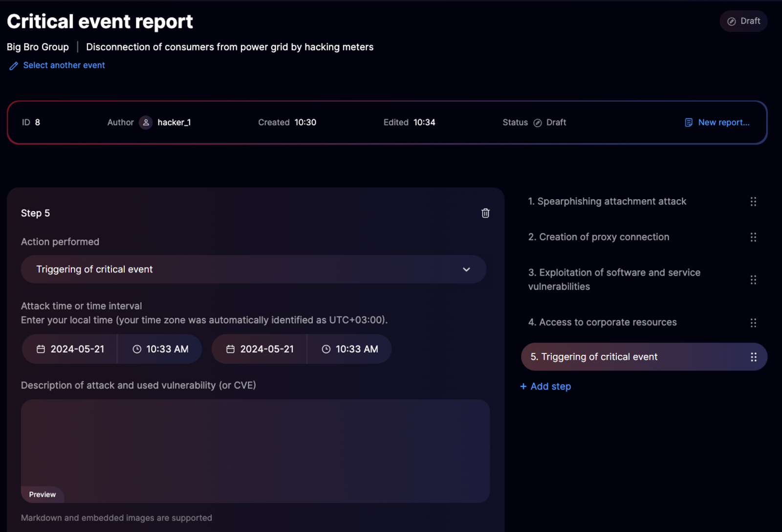 Important: the attack time is set automatically, so don't forget to change it manually before you submit your report. Use your local time zone.