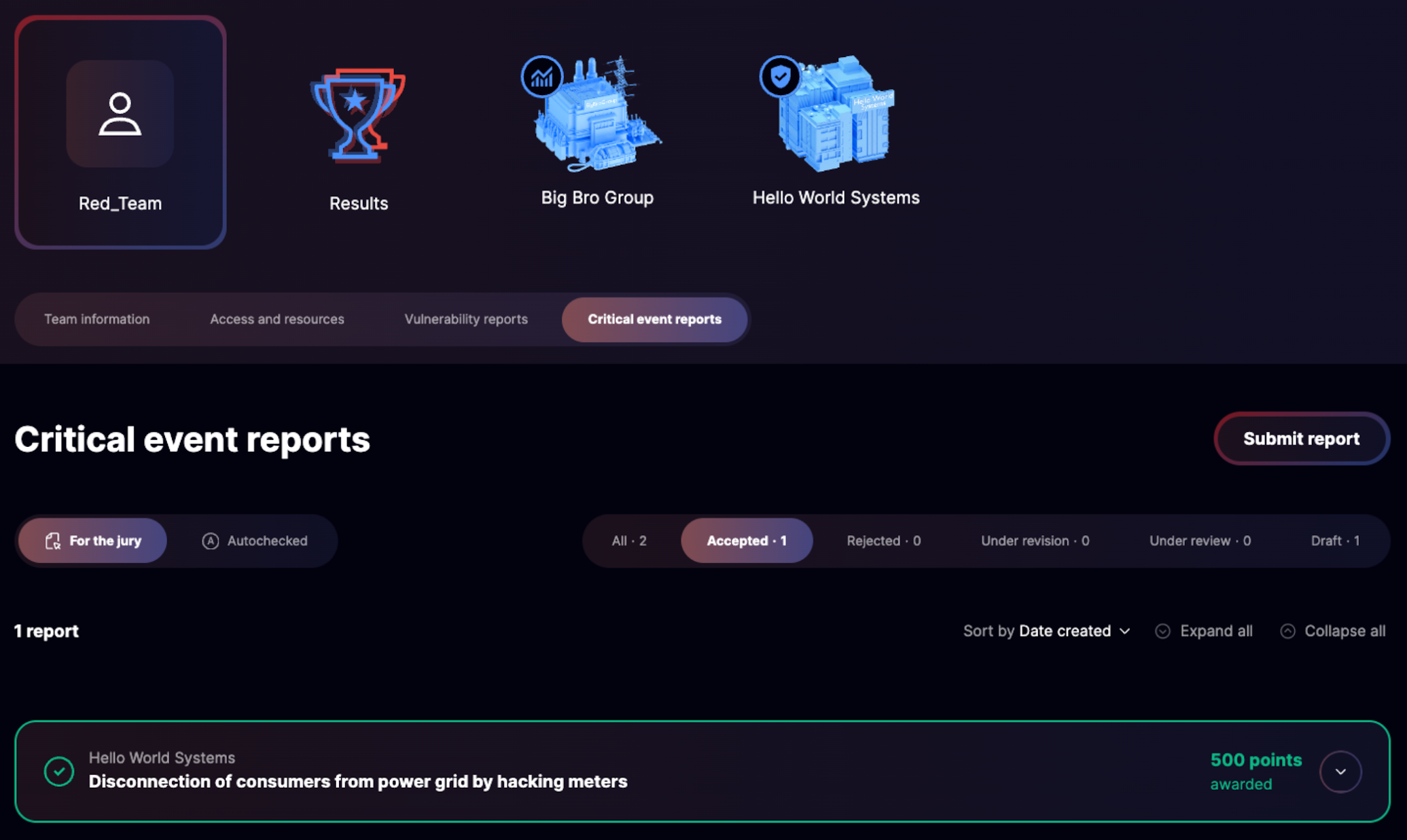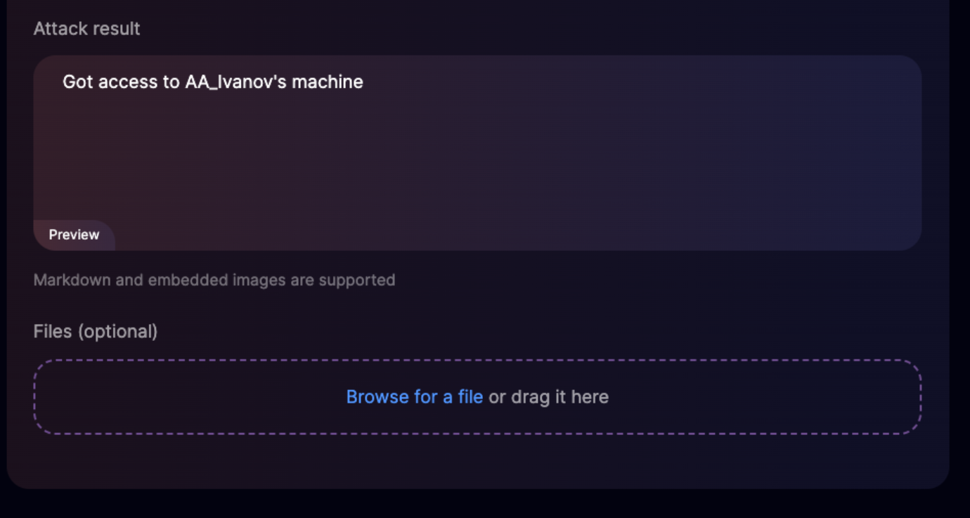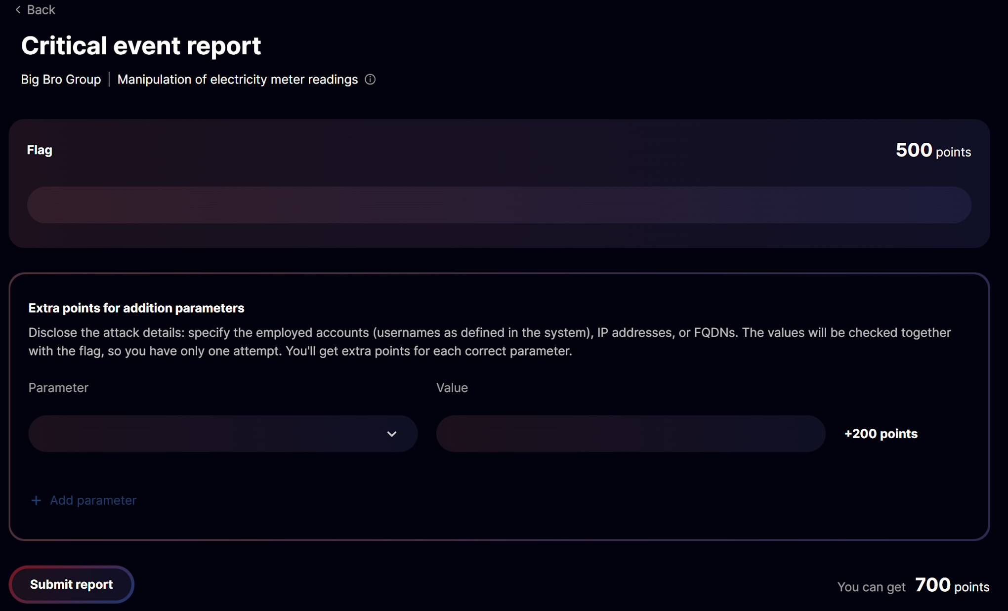 Depending on the parameters of the cyberbattle, some critical events can help you earn extra points, for instance, by revealing attack vector details or providing information about accounts and nodes. The values will be checked together with the flag, so you have only one attempt. For every correct parameter, you'll score some extra points.