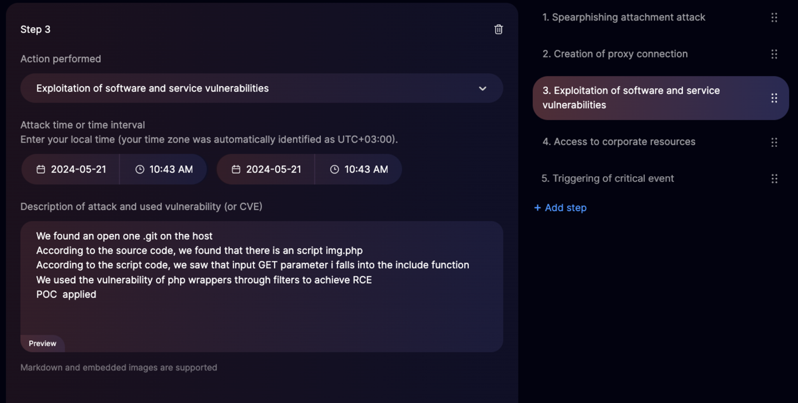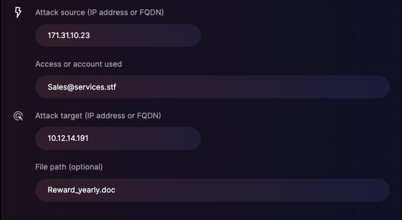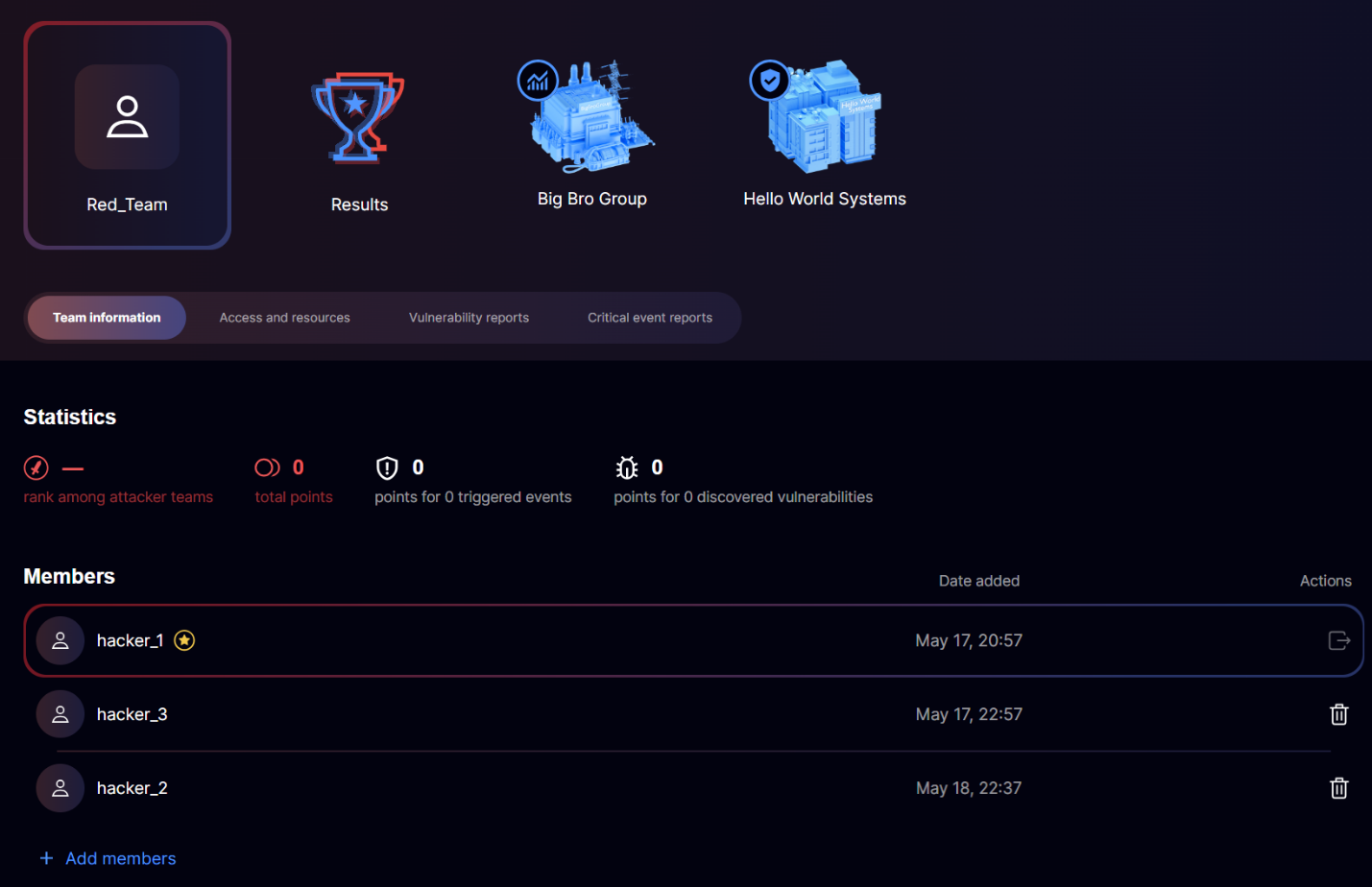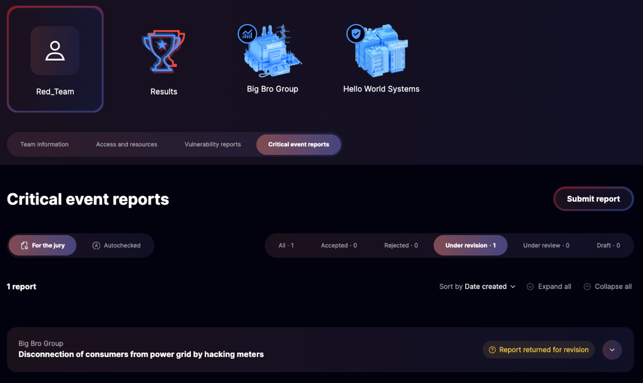 Depending on the parameters of the cyberbattle, some critical events can help you earn extra points, for instance, by revealing attack vector details or providing information about accounts and nodes. The values will be checked together with the flag, so you have only one attempt. For every correct parameter, you'll score some extra points.